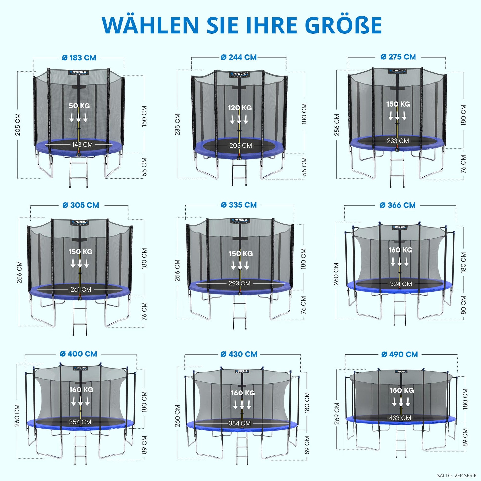 - ✅ PRODUKTDETAILS: Durchmesser: 305 cm, Sicherheitsnetz außenliegend, Höhe Sprungmatte: 76 cm, max. Belastung bis 160 kg. Das Outdoor Gartentrampolin von Kinetic Sports zeichnet sich durch eine qualitativ hochwertige Verarbeitung, hervorragende Sicherheitsaspekte und ein sehr gutes Preis-Leistungs-Verhältnis aus. Seit über 12 Jahren bringen wir Deutschland in Bewegung. Profitieren auch Sie von unserer langjährigen Erfahrung & Kundensupport in Deutschland!